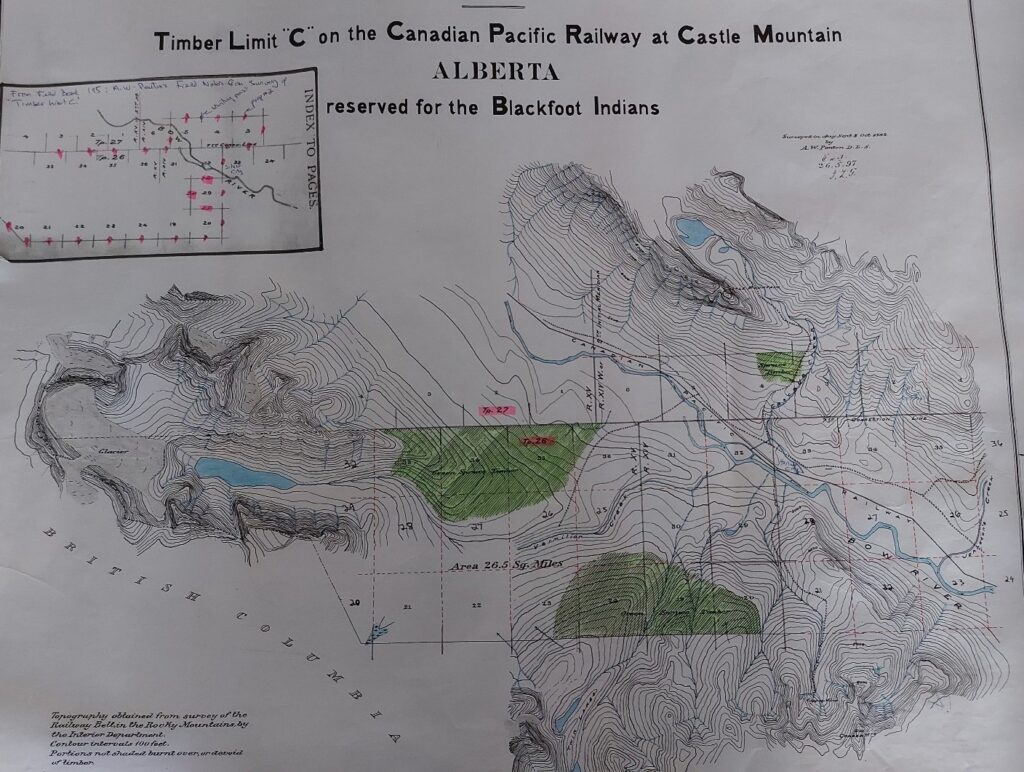 This is a map showing Blackfoot Nation Tim- ber Berth Rights in the Castle Mountain area, part of Treaty 7.